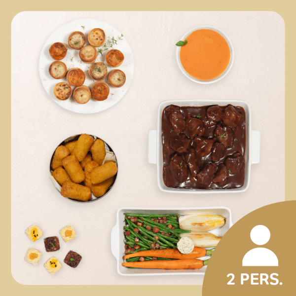 12 aperitiefhapjes, ± 550 ml tomatensoep met mascarpone, ± 600 g bereide varkenswangetjes in rodewijnsaus, 12 ambachtelijke aardappelkroketten, ± 365 g winterse ovengroenten, trio van mousses (2x3)