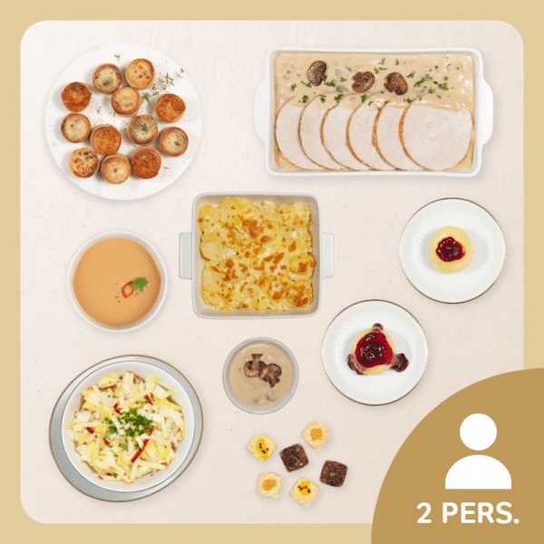 12 aperitiefhapjes, ± 550 ml oosterse kokossoep, ± 300 g gebakken kalkoenfilet gesneden, ± 340 g archiducsaus, ± 500 g aardappelgratin, ± 420 g witloofsalade met bieslookvinaigrette, 2 appels met veenbessensaus, trio van mousses (2x3)