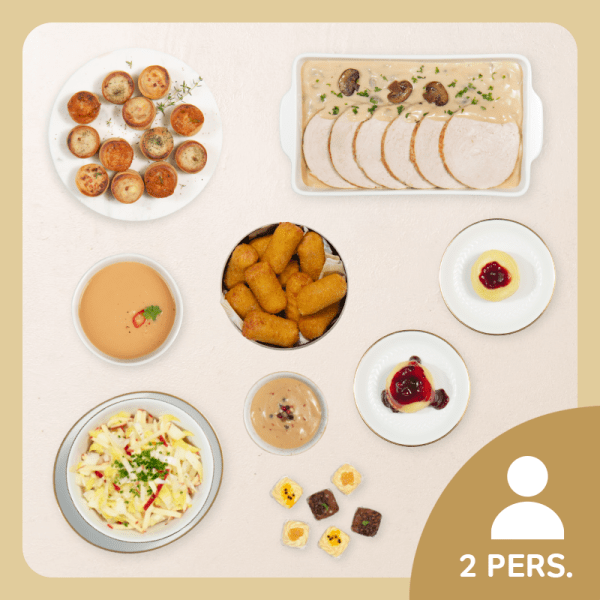 12 aperitiefhapjes, ± 550 ml oosterse kokossoep, ± 300 g gebakken kalkoenfilet gesneden, ± 340 g peperroomsaus, 12 ambachtelijke aardappelkroketten, ± 420 g witloofsalade met bieslookvinaigrette, 2 appels met veenbessensaus, trio van mousses (2x3)