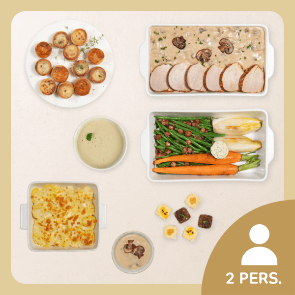 12 aperitiefhapjes, ± 550 ml bloemkool-pastinaaksoep, ± 500 g gebakken varkenshaasje, ± 340 g archiducsaus, ± 500 g aardappelgratin, ± 365 g winterse ovengroenten, trio van mousses (2x3)