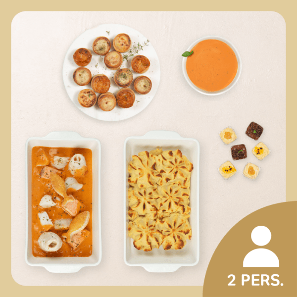 12 aperitiefhapjes, ± 550 ml tomatensoep met mascarpone, ± 620 g vispannetje royal, ± 600 g puree duchesse, trio van mousses (2x3)