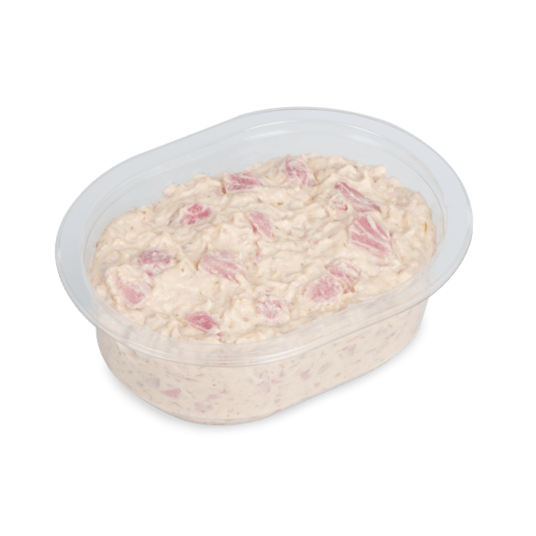 | Ingrediënten | kookham 56% (varkensvlees 90%, zout, glucosestroop, dextrose, aroma's, MELKeiwit, dierlijk eiwit (varken), kruiden, specerijen, rookaroma, groentepoeder, suiker, conserveermiddel (E250, E252), zuurteregelaar (E262, E326, E331, E500), antioxidant (E301), stabilisator (E407, E415, E450, E451), smaakversterker (E621)) koolzaadolie, water, EIgeel, azijn, gemodificeerd zetmeel, ui, MOSTERD, zout, suiker, kruiden, specerijen, aroma, citroensap, fermenten, glucosestroop, kleurstof (E160a), conserveermiddel (E202, E211), zuurteregelaar (E261, E262, E270, E330, E575), antioxidant (E385), stabilisator (E412, E415). Kan tarwe, soja, selderij bevatten. |