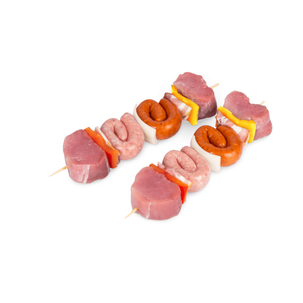 varkensvlees 72%, ui, paprika, merguezsaus (water, tomatenpuree, specerijen, suiker, koolzaadolie, smaakversterker (E621), aroma, extract van paprika, kruiden, look, stabilisator (E415), conserveermiddel (E211, E202), voedingszuur (E330), antioxidant (E300), lamsvlees 1%, zout, antioxidant (E316, E301), conserveermiddel (E250, E252), rook, broodkruim (TARWE), schapendarm, zuurteregelaar (E262, E331), voedingszuur (E326, E261), rundvlees 0,5%, specerijen, specerijextracten, gistextract, aroma, rode bietensap |