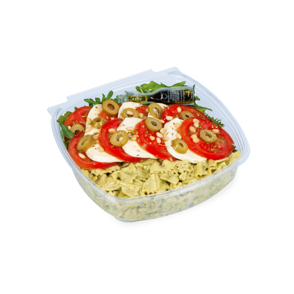 Ingrediënten | tomaat 40%, MOZZARELLA 19%, farfalle ( TARWEgriesmeel, water, zonnebloemolie, zout), rucola, groene olijven, pesto Genovese 3% (zonnebloemolie, KAAS, basilicum, water, pijnboompitten, olijfolie, look, zout, citroenvezel, voedingszuur (E270), conserveermiddel (E202)), koolzaadolie, YOGHURT, suiker, EIgeel, azijn (balsamico), honing, zout, gemodificeerd zetmeel, raapolie, look, pijnboompitten, zonnebloemolie, italiaanse KAAS (MELK, zout, stremsel, EI-lysozym), specerijextracten, basilicum, peterselie, oregano, conserveermiddel (E202, E211, E270), voedingszuur (E270, E300), zuurteregelaar (E330), stabilisator (E412, E415) |