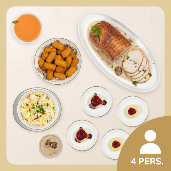 ± 1,1 l tomatensoep met mascarpone, ± 800 g kalkoenfiletgebraad, ± 680 g archiducsaus, 24 ambachtelijke aardappelkroketten, ± 840 g witloofsalade met bieslookvinaigrette, 4 appels met veenbessensaus