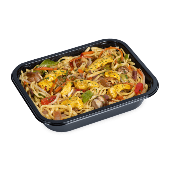 wokgroenten, kippenreepjes curry, oosterse saus