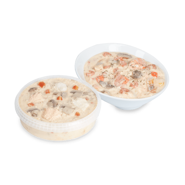 zalm, kabeljauw, grijze garnalen, prei, wortel, champignon, kreeftensoep, room, witte wijn, visfumet