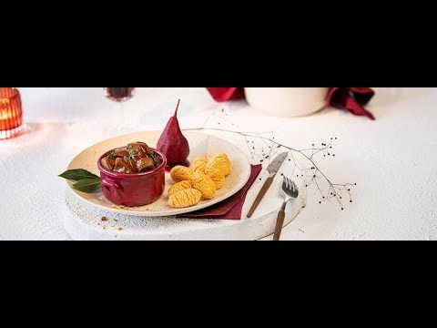 Serveer de ragout in cocottepotjes of diepe borden. Werk af met de krokante dennenappels en 1 à 2 peertjes in rode wijn.